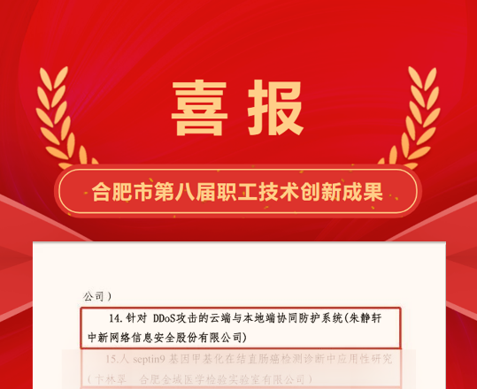 喜報(bào)|“針對(duì)DDoS攻擊的云端與本地端協(xié)同防護(hù)系統(tǒng)”獲合肥市第八屆職工技術(shù)創(chuàng)新成果三等獎(jiǎng) |