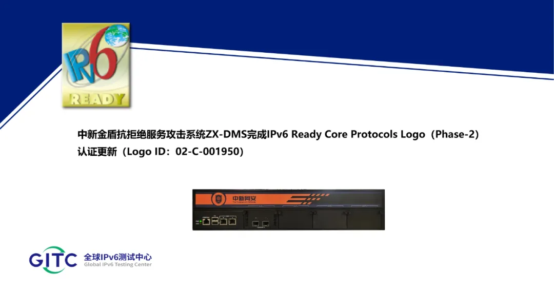 中新網(wǎng)安 | 中新金盾抗拒絕服務(wù)攻擊系統(tǒng) ZX-DMS 完成IPv6 Ready Logo認(rèn)證更新 |